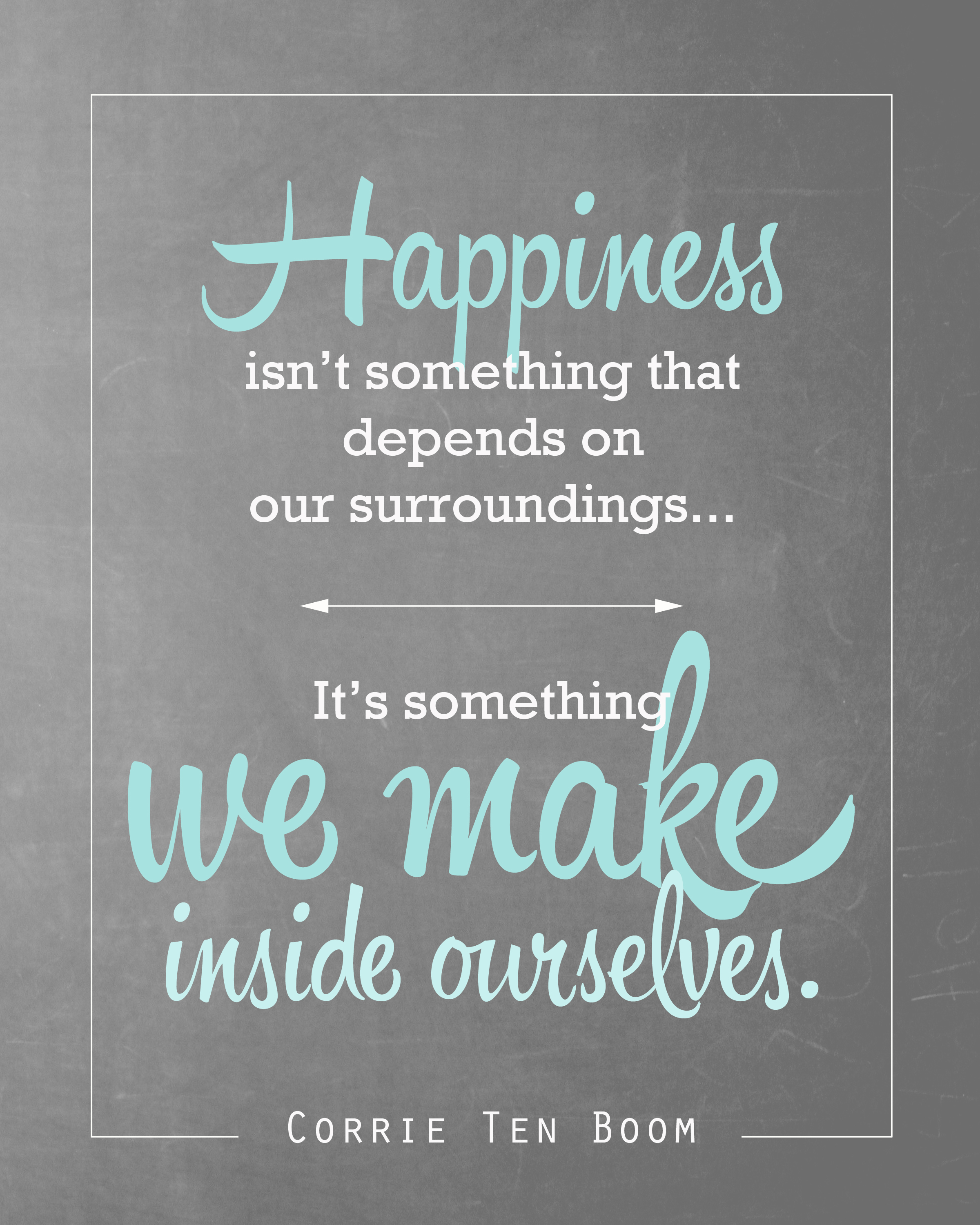 After last month’s quote printable failure and subsequent round-up of some of my favorite quote printables by other bloggers, I actually had a successful time putting together a new printable for this month. A good friend suggested this quote by Corrie Ten Boom: “Happiness isn’t something that depends on our surroundingsโฆ It’s something we make inside ourselves.”