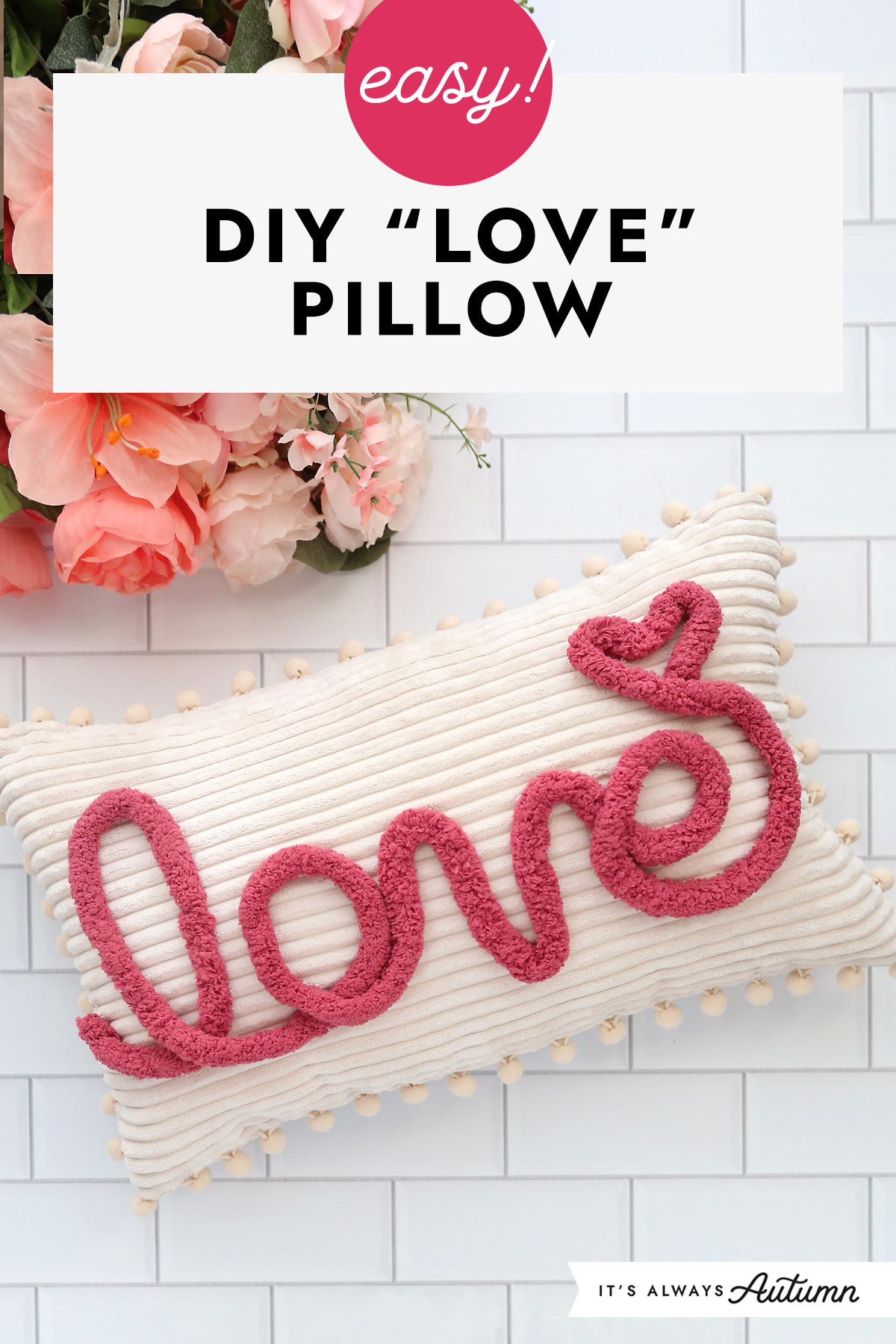 I don’t know about anyone else, but I’m just barely feeling back in the groove after Christmas break – and somehow it’s almost Valentine’s Day! I decided I needed a SUPER easy craft to work on this week, and this cute throw pillow fit the bill. All you do is use chunky yarn to spell out a word on a pillow cover – easy, quick, and fun. Mine is Valentine’s themed, but you could add any word you like!