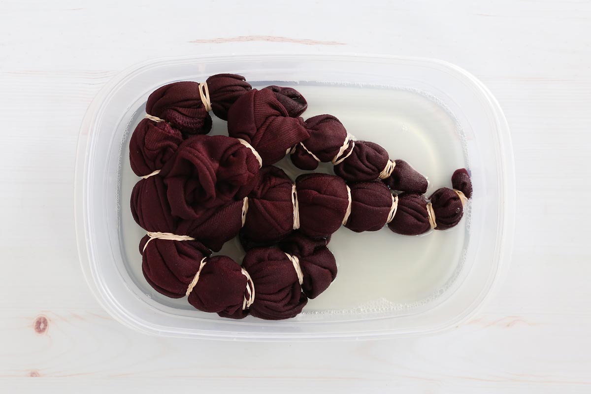 Remember to wrap the rubber bands quite tight. They are what keep some portions of the shirt from getting any bleach. If you don’t wrap the rubber bands very tight, almost all of the shirt will get bleached and you won’t have many darker areas left.
