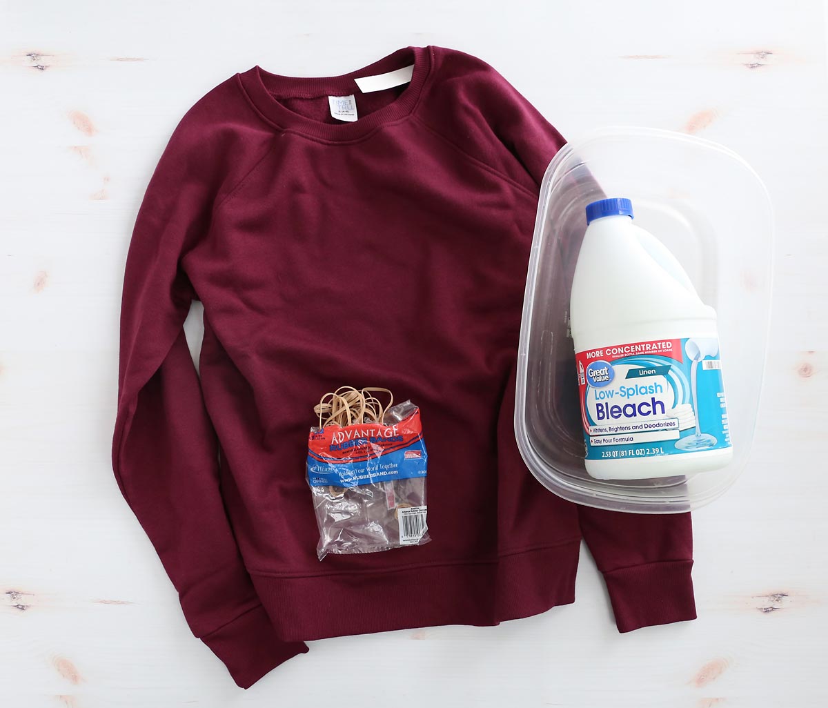 You only need a couple of things to bleach tie dye a shirt. No need to purchase a tie dye kit! Here’s what I used: