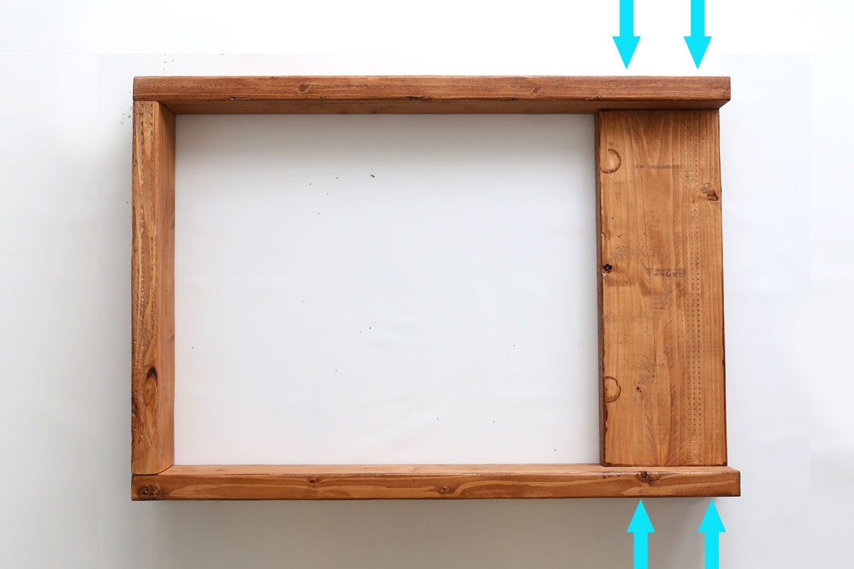 Begin by creating a U-shape with the 21 inch piece of 2×4 and the (2) 34 inch pieces of 2×4, and shown below. You’ll use two screws to attach each longer piece to the shorter piece, as shown by the blue arrows.