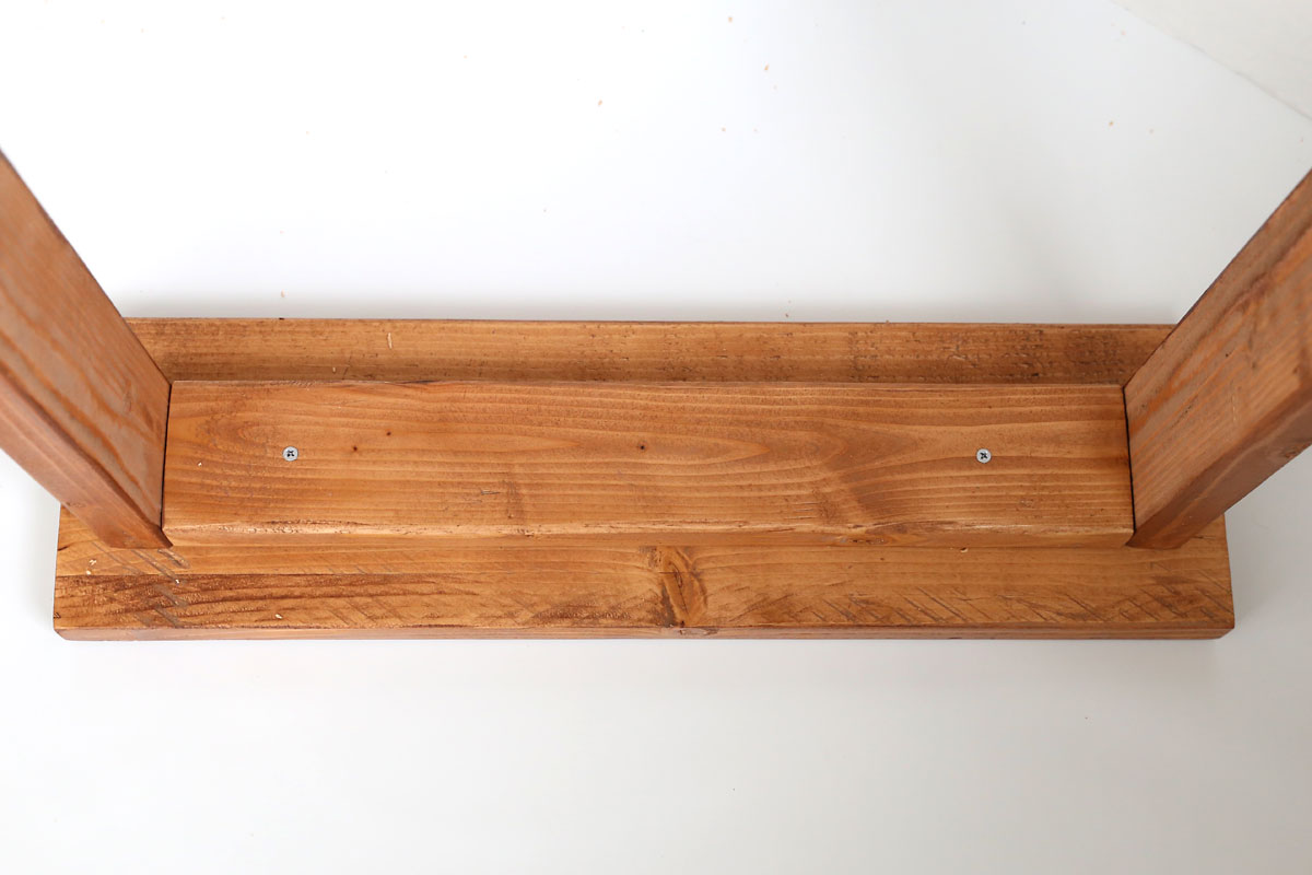 - Place the piece with the hook on top of the stand. The hook should sit right behind the front piece. Attach the top with two screws through the 2×4 into each side.