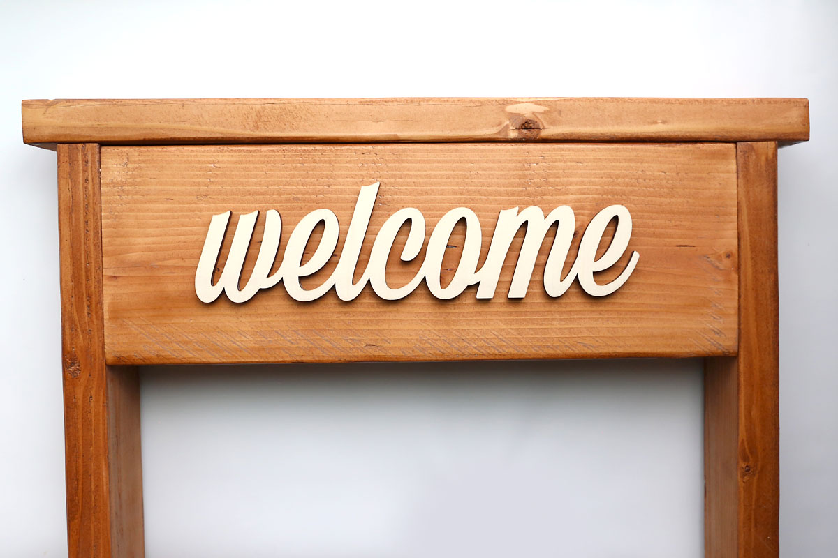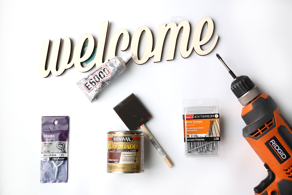 - Welcome wood cutout: I used this one from Hobby Lobby; you could also use a vinyl word or a stencil and paint