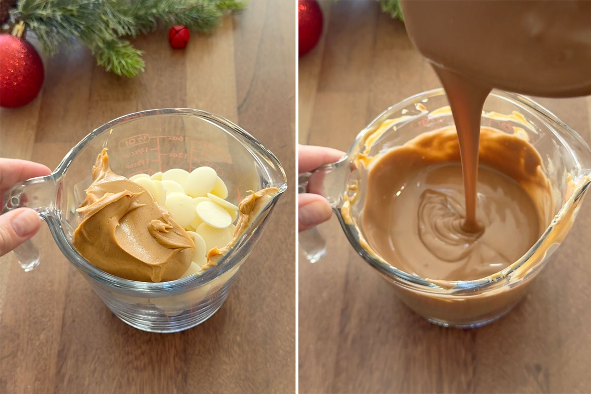 Begin by placing the milk chocolate melting wafers, white melting wafers, and creamy peanut butter in a glass measuring cup (or other microwave proof bowl). Microwave for thirty seconds, stir, then microwave for another thirty seconds. Stir thoroughly; the mixture should be smooth and completely incorporated.