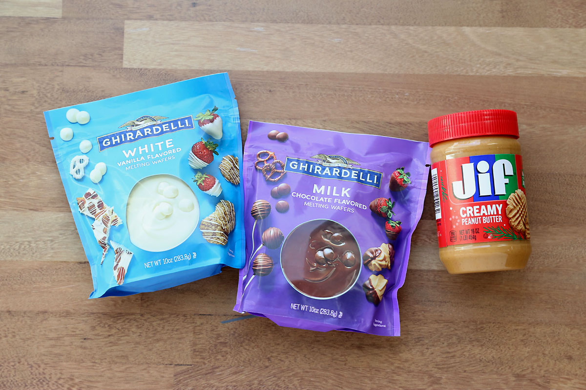 You’ll notice I’m using melting wafers instead of chocolate chips or dipping chocolate, and that’s intentional. Melting wafers are made to melt easily and set up nicely, while real dipping chocolate is much more finicky to work with, requiring specific melting and cooling temperatures to get a nice finish. Milk chocolate and white chocolate chips could probably be used instead of the melting wafers here, but they will result in a thicker mixture and may need a little bit of vegetable or coconut oil stirred in to get a nice pouring consistency. So for best results, I recommend using the melting wafers.
