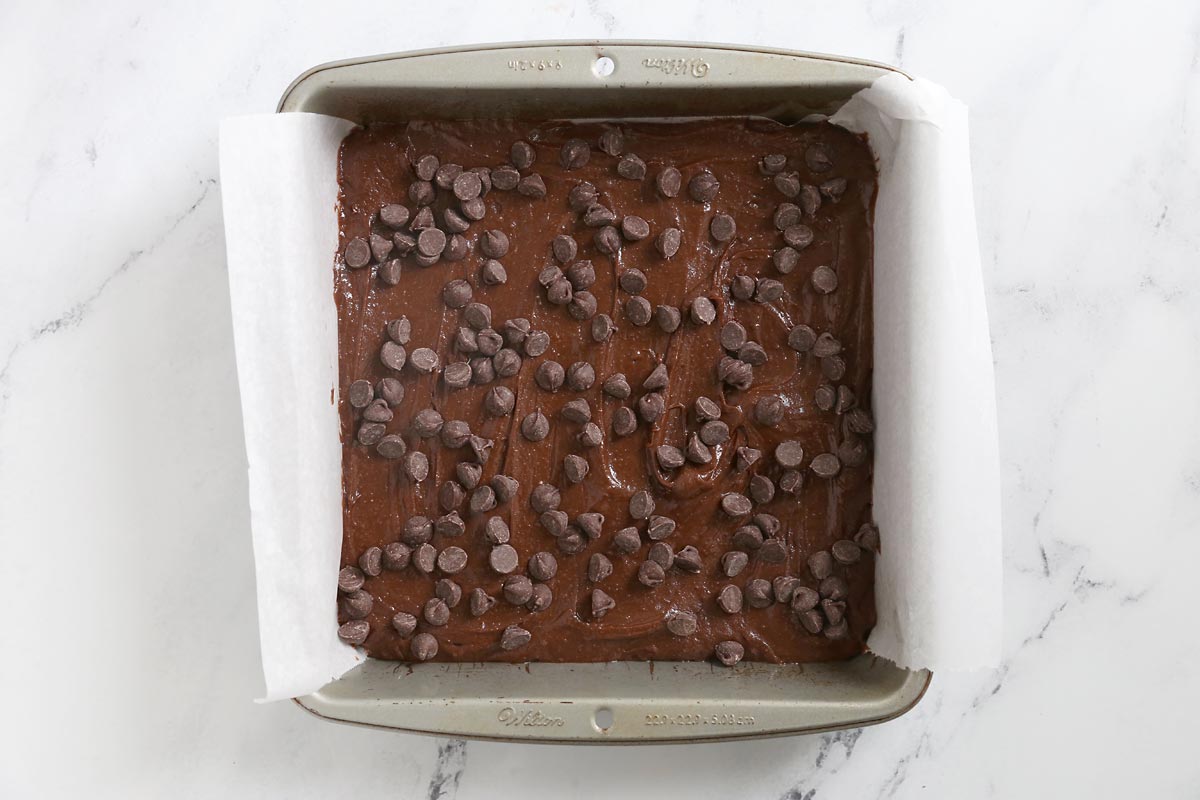 Stir together the brownie batter, using melted butter instead of oil for a perfect fudgy texture. Spread about 2/3 of the brownie batter in a prepared 9×9 pan, then sprinkle half a cup of chocolate chips over the batter. I like to line the pan with parchment paper so it’s easy to remove the brownies after baking.
