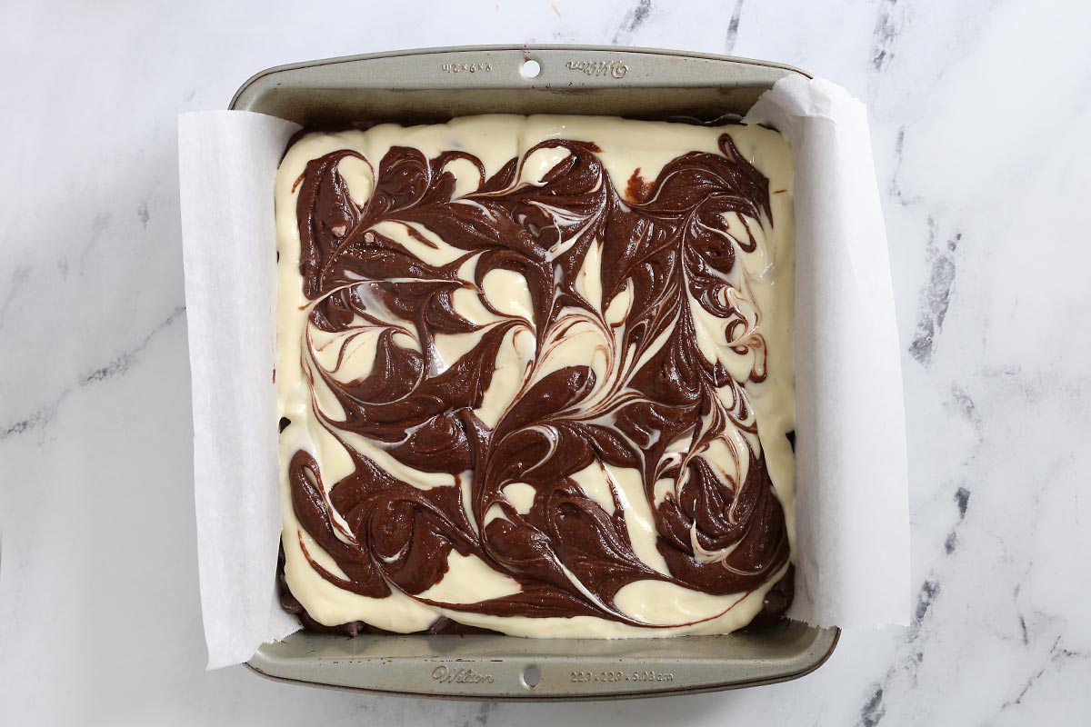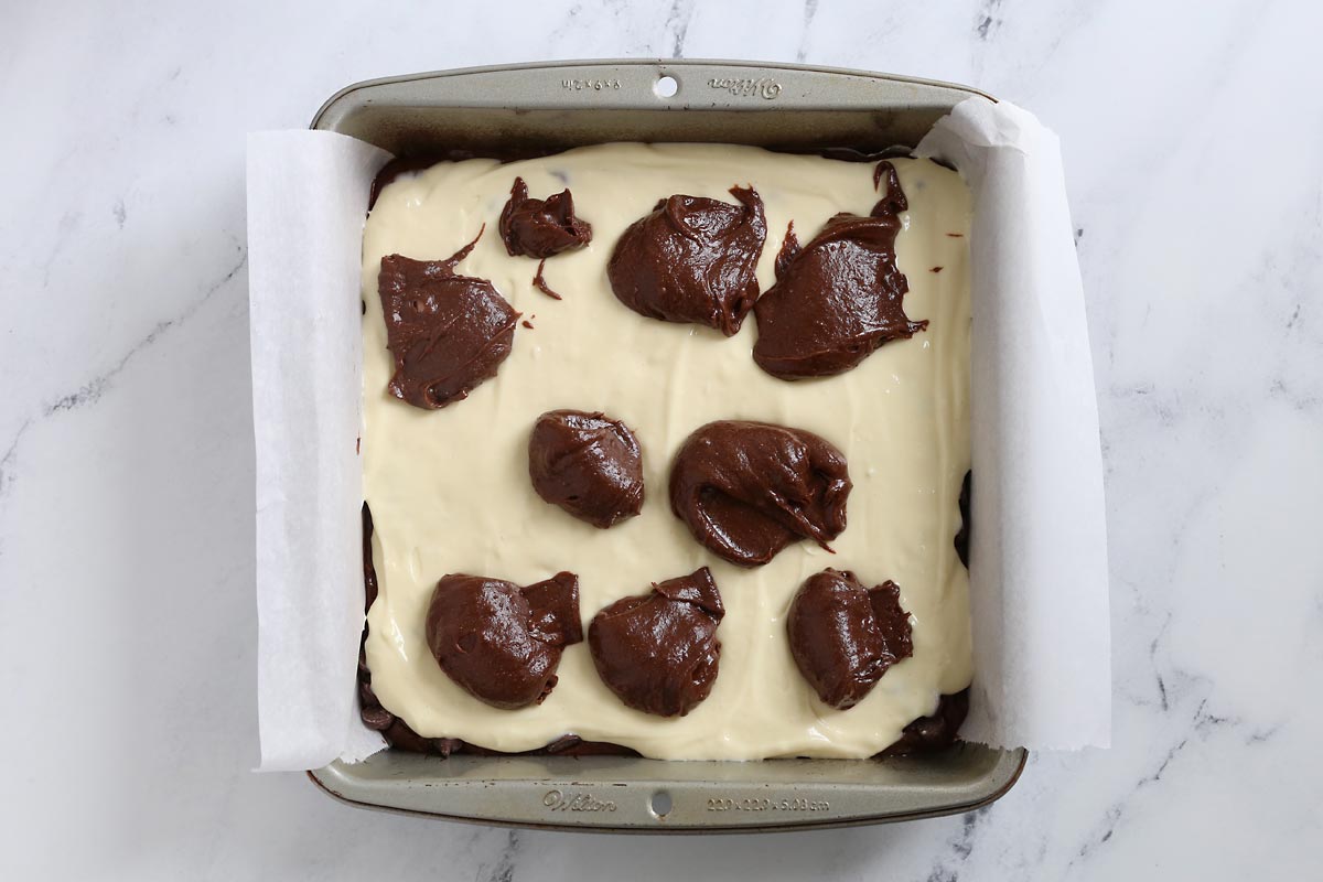 - Spread the cream cheese batter over the brownie batter. Drop the remaining brownie batter on top by spoonfuls. Use a toothpick to swirl the two batters together.