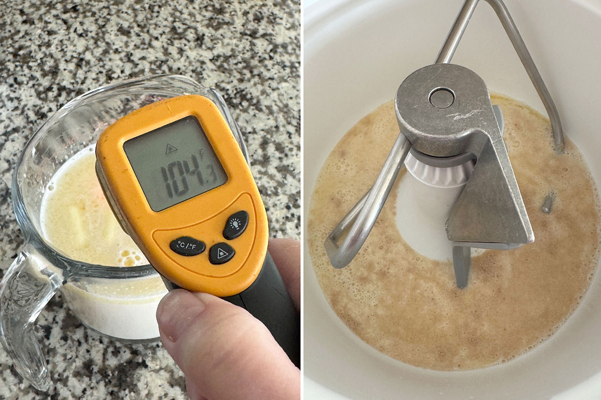 - Place the yeast in the bowl of a stand mixer. Place the milk, honey, and butter in a microwave safe measuring cup or bowl. Microwave 60-90 seconds, until the butter is mostly melted and the mixture is between 100 and 110 degrees farhenheit. Pour the warmed liquid over the yeast and let it stand for 5 minutes. You'll see the yeast start to bubble and foam.
