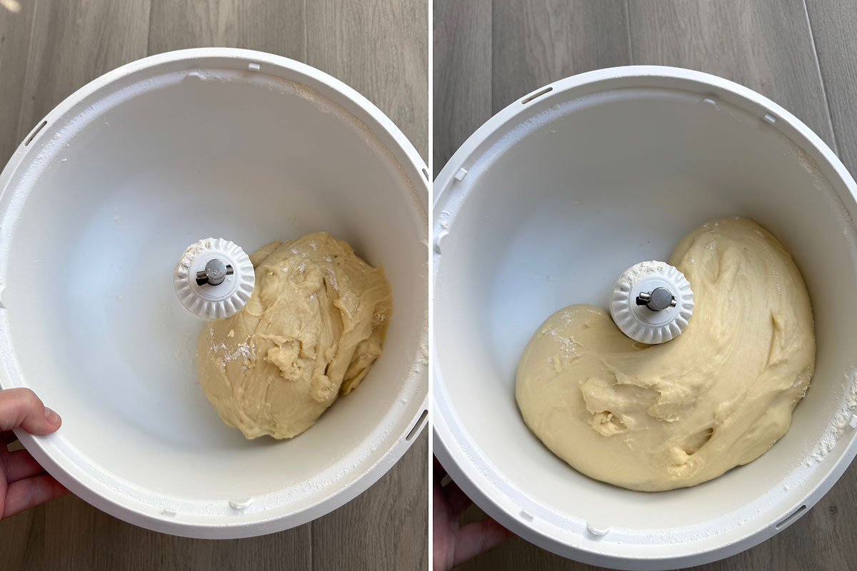 Once the yeast is foamy, you can add the rest of the ingredients: an egg, the sugar, salt, and 3 cups of flour. Using the dough hook, turn the mixer on to medium high and let the ingredients incorporate. Then you’ll gradually add up to one more cup of flour until the dough is pulling away from the sides of the bowl, like you see in the first photo below. The dough should still stick to the center post (if using a Bosch) or the bottom of the bowl (if using a Kitchenaid) and be slightly sticky – so don’t add too much flour! Once it pulls away from the sides, let it continue to knead for about 7 minutes until it is smooth and stretchy and can pass the “windowpane test”.