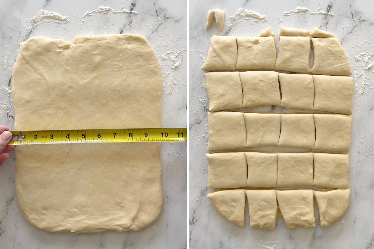 - Turn the dough out onto a floured surface and gently roll into a 10×12 inch rectangle. Use a pizza cutter to slice the dough into 20 squares. Place the squares onto a greased or lined half sheet pan (cookie sheet) and cover again.
